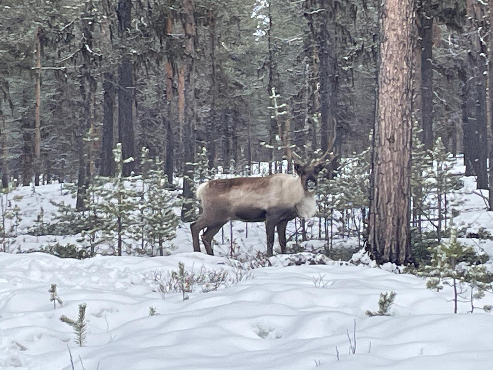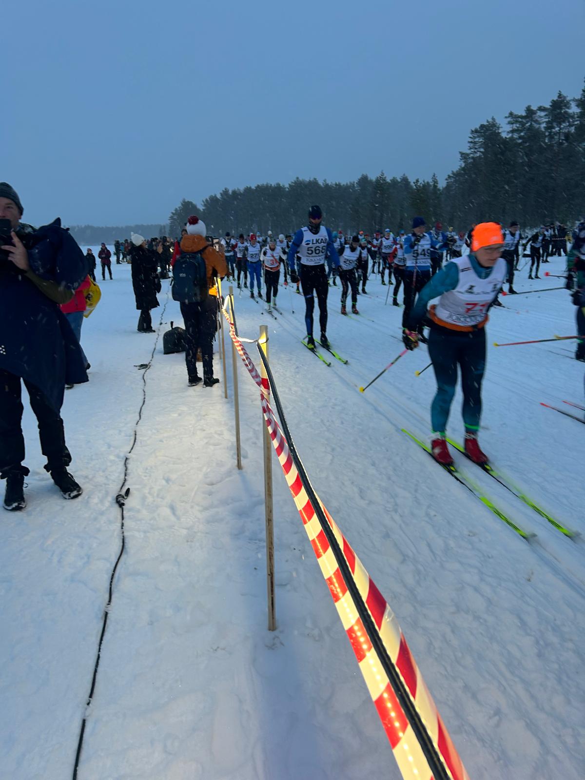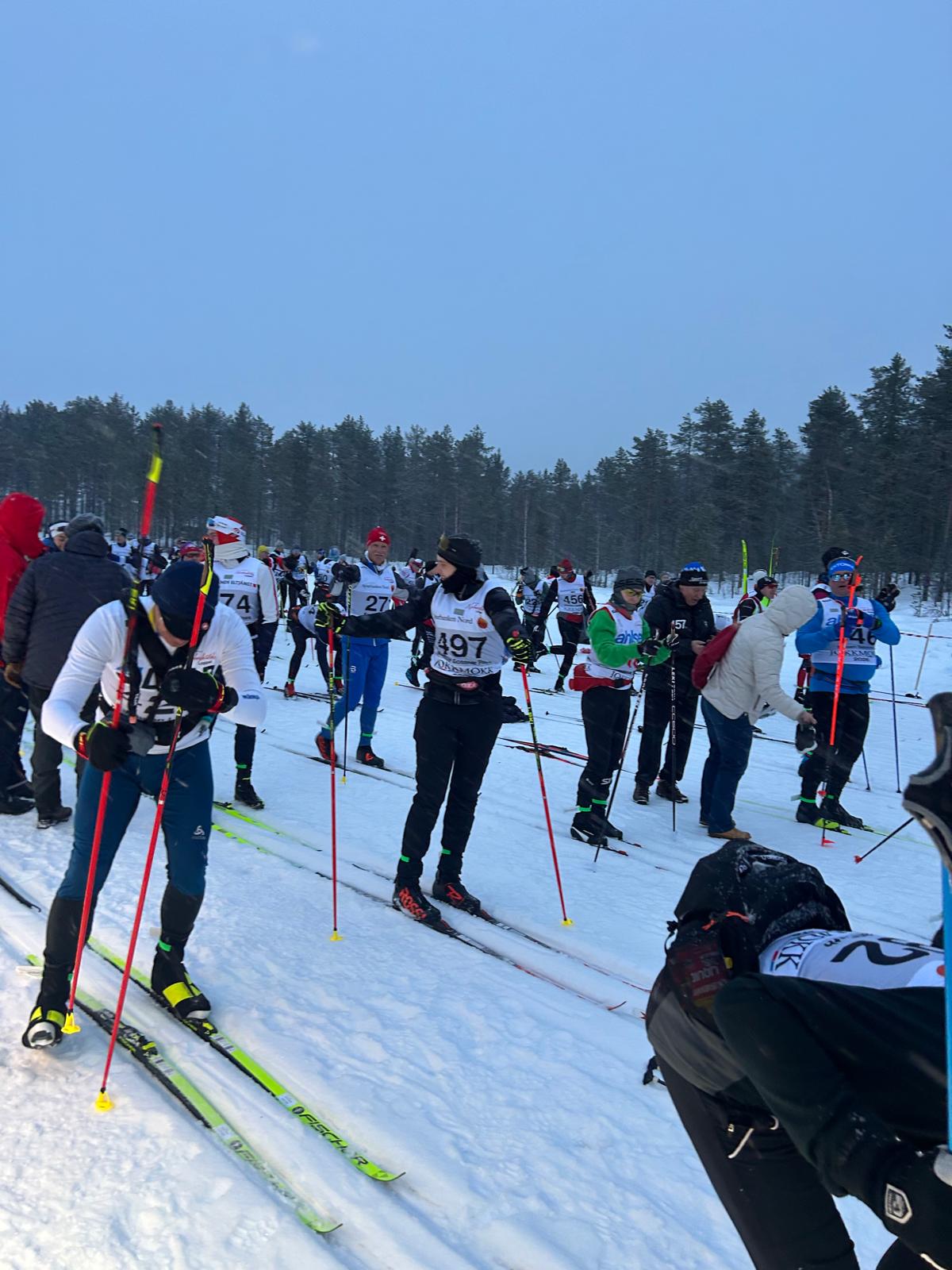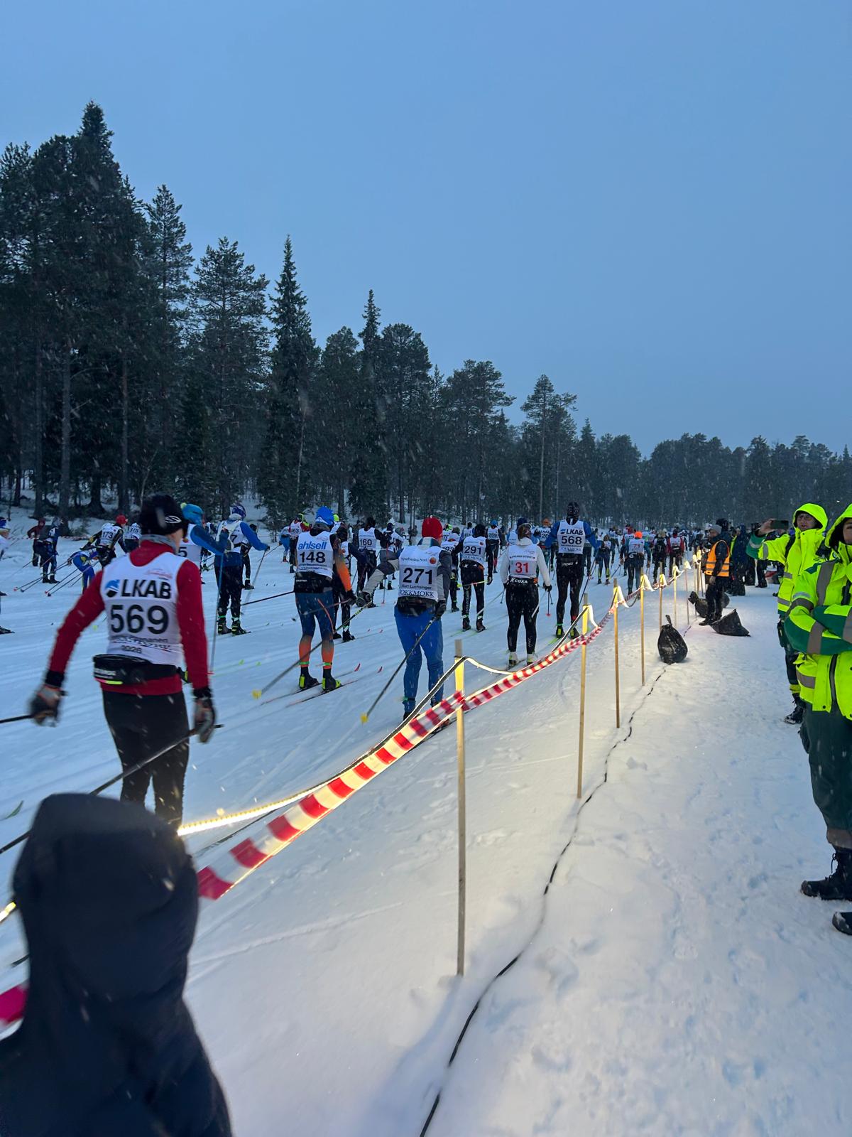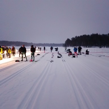 5 Uhr Morgens und es geht los.Es wird nicht gerammelt, wie bei anderen Massenstarts, es ist eher entspannt und sehr ruhig. Ein leises Gleiten wird zu einem Rhythmus, ein Rhythmus zu einem Marsch. Die ersten Kilometer führen durch verschneite Wälder, vorbei an gefrorenen Flüssen und über weite zu gefrorene Seen und offene Ebenen. Die Rentiere und die Natur schaut zu – unbeeindruckt, majestätisch. Nach 17 Km Stockbruch auf einem der zugefrorenen Seen. Kurzer Stopp und allen anderen entgegen laufen zurück zur nächsten Verpflegungsstation bei Km16. Meine Gruppe in der ich war aufwiedersehen, neue Stöcker und der Lauf beginnt von vorn. Erstmal wieder reinkommen und Rhythmus finden.